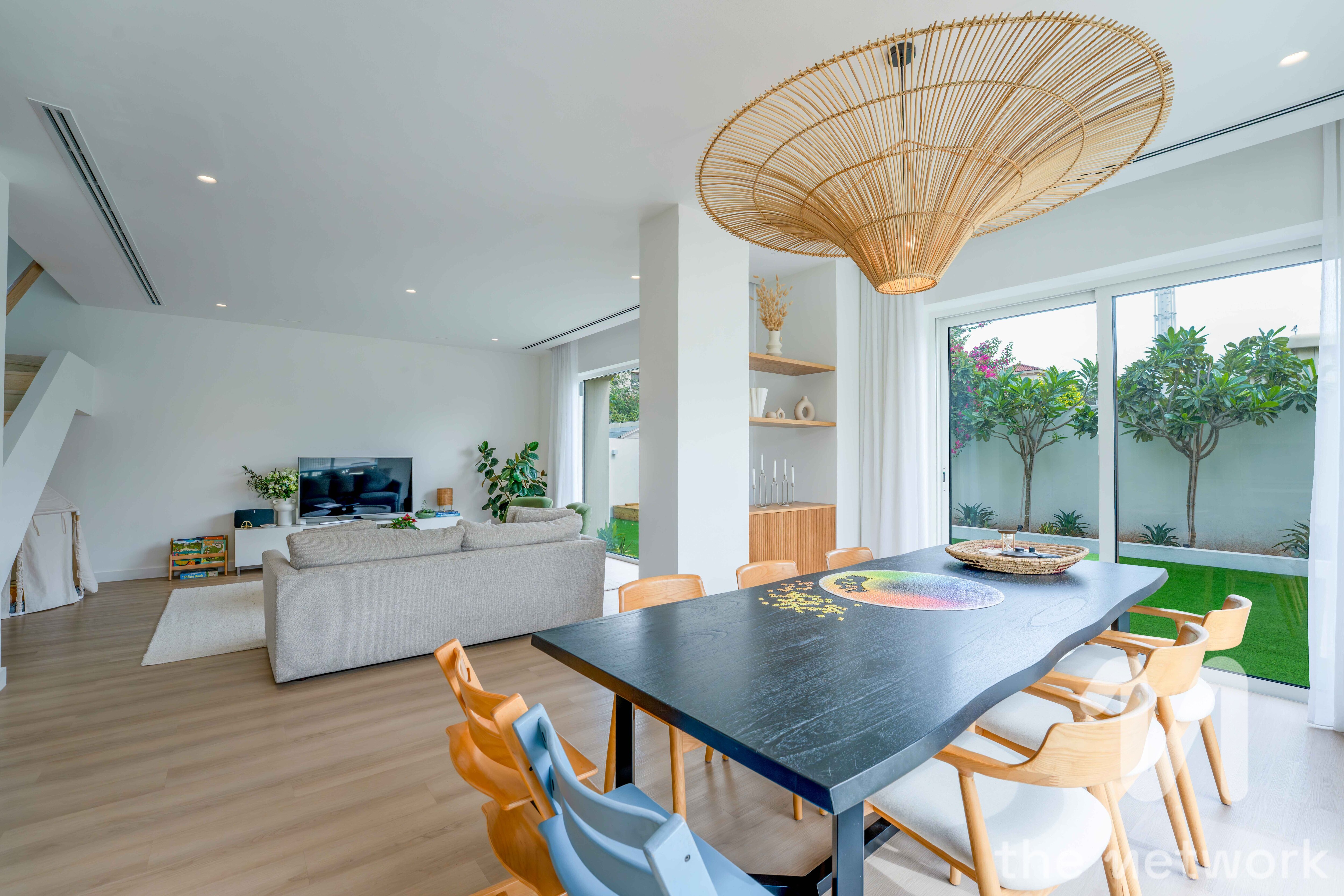 - Open-plan living and dining area with abundant natural light