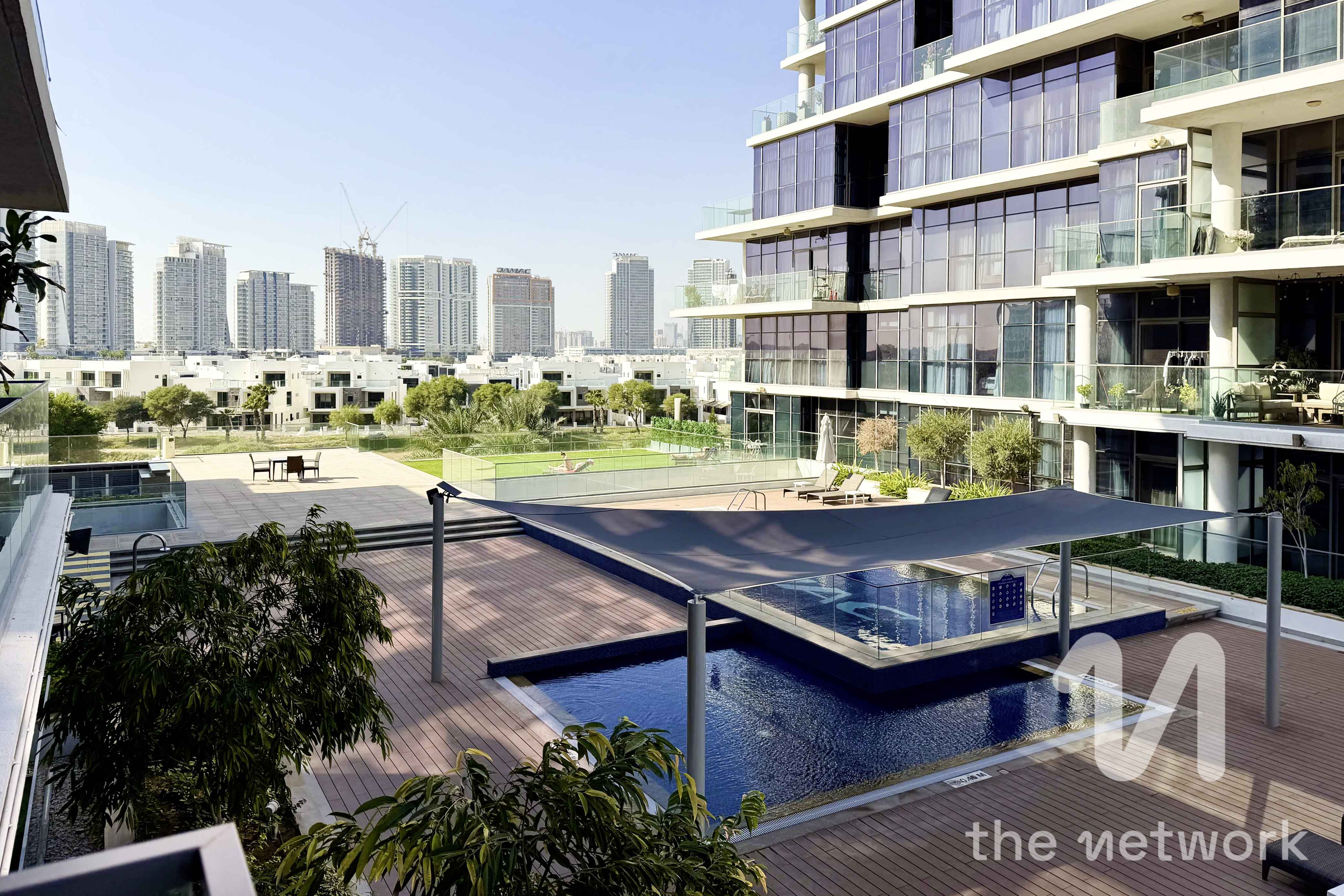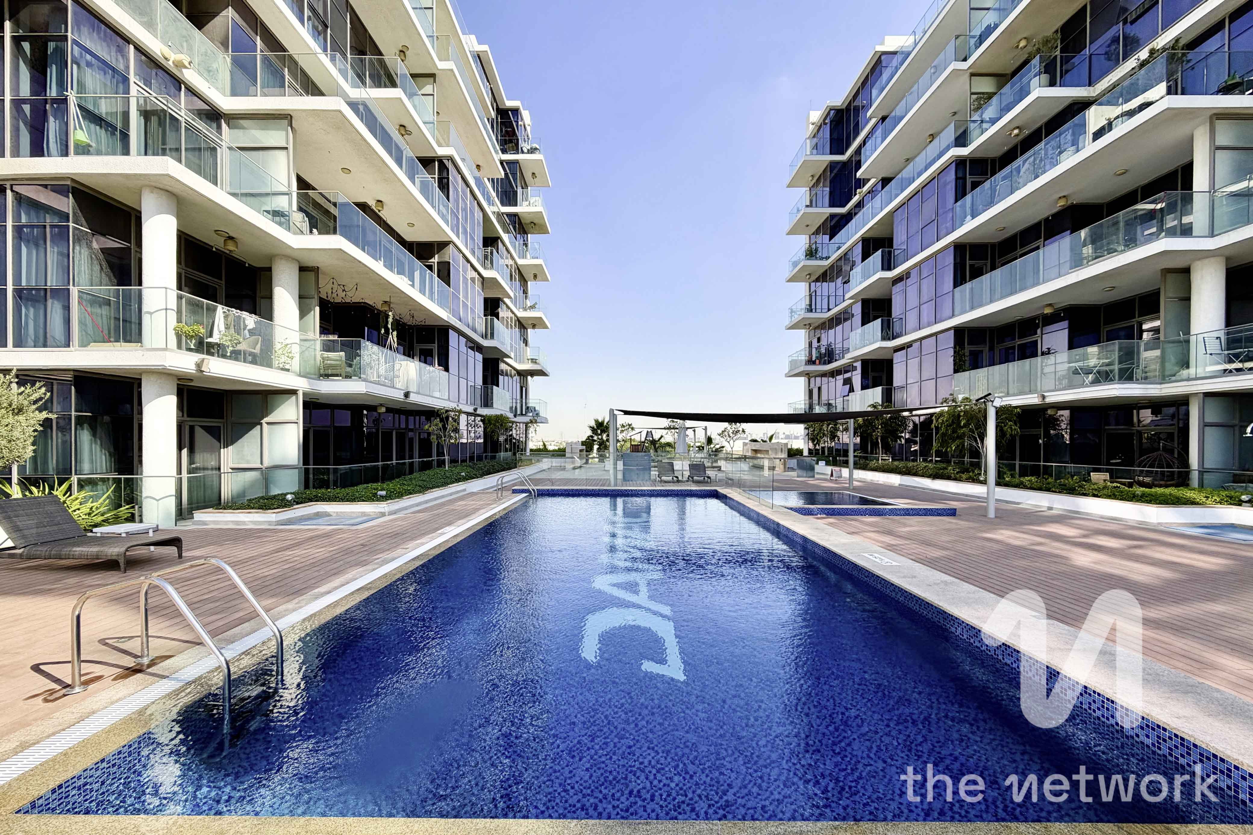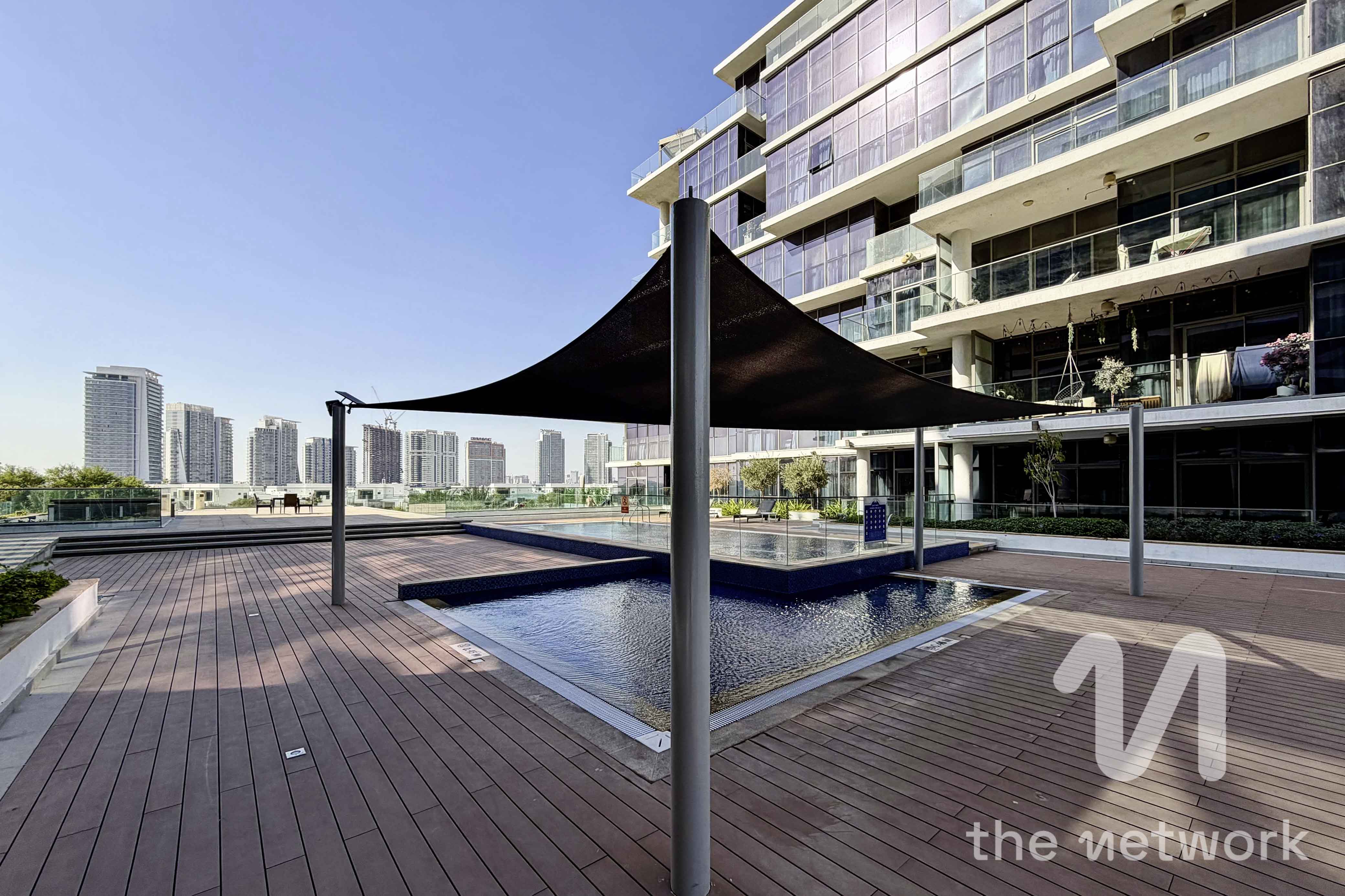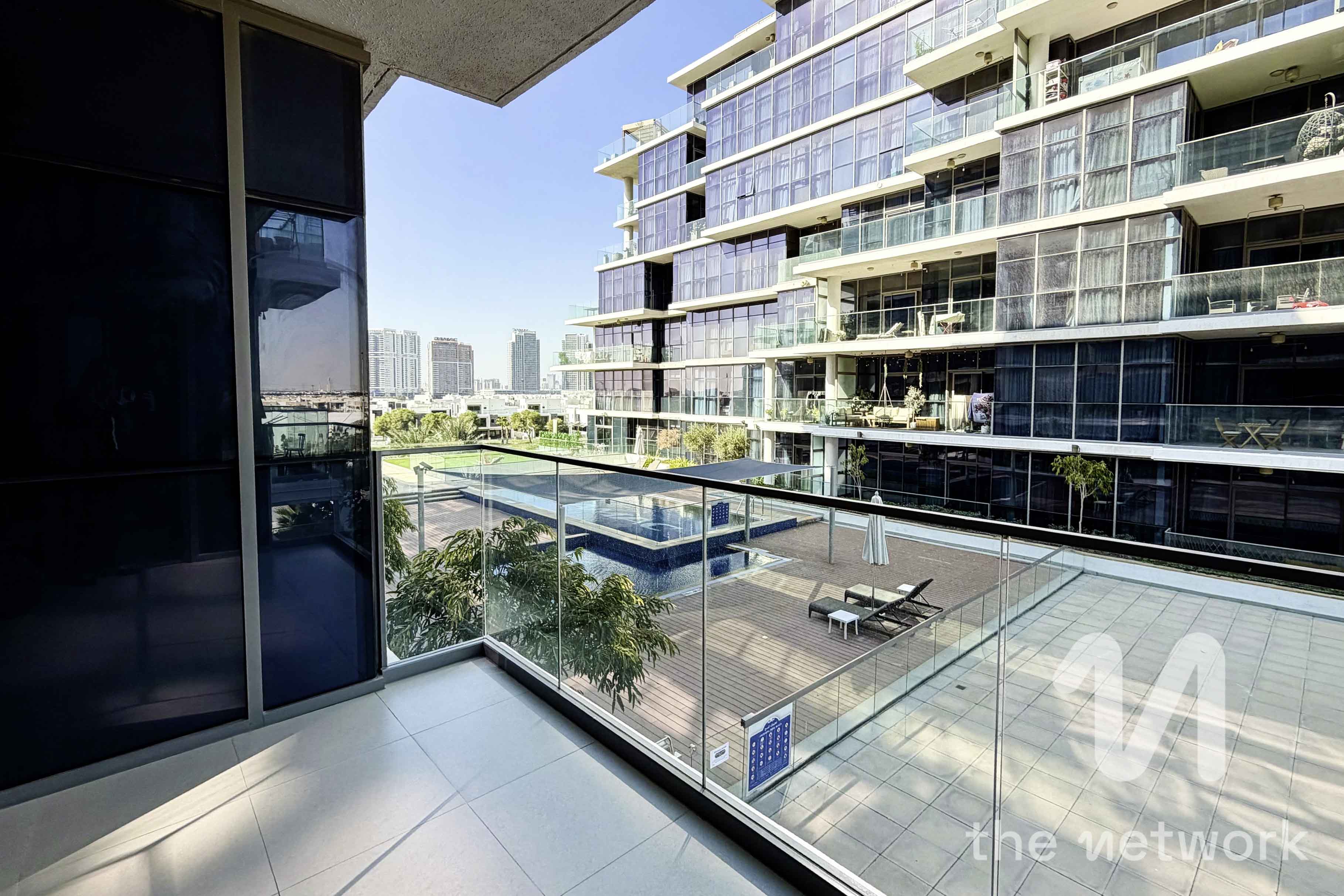 Exclusively listed, spacious 1 bed apartment in Golf Terrace A, Damac Hills available to rent benefiting from a pool view. The property is offered furnished or unfurnished.